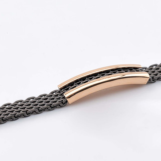 In foto da sx a dx: Bracciale oro rosa, PVD nero e acciaio, Anello oro rosa e diamanti neri, Bracciale multimateriale